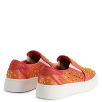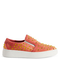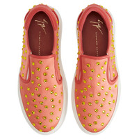 Product Details These slip-on sneakers, crafted from pink synthetic fabric and leather with white rubber soles and matching technical fabric inner lining, feature an all-over yellow rhinestones embroidery and a debossed golden ‘GZ’ logo on the back of the upper. Women's sneakers Pink synthetic fabric and pink leather Yellow rhinestones embroidery on upper Debossed golden 'GZ' logo on the back Pink technical fabric inner lining White rubber sole with logo Made in Italy