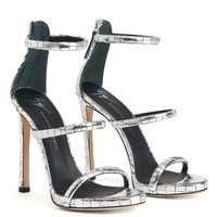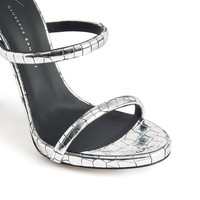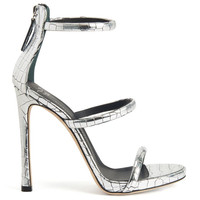 Product Details Sandals crafted from laminated silver synthetic fabric with a crocodile print, featuring thin straps, a back zipper fastening with matching puller, matching covered stiletto heels with internal platform and a leather sole with logo. Laminated silver synthetic fabric with crocodile print Three straps Zipper fastening on the back Heel covered in laminated silver synthetic fabric with crocodile print 120 mm heel 10 mm inner platform covered in laminated silver synthetic fabric with crocodile print Leather sole with logo Made in Italy