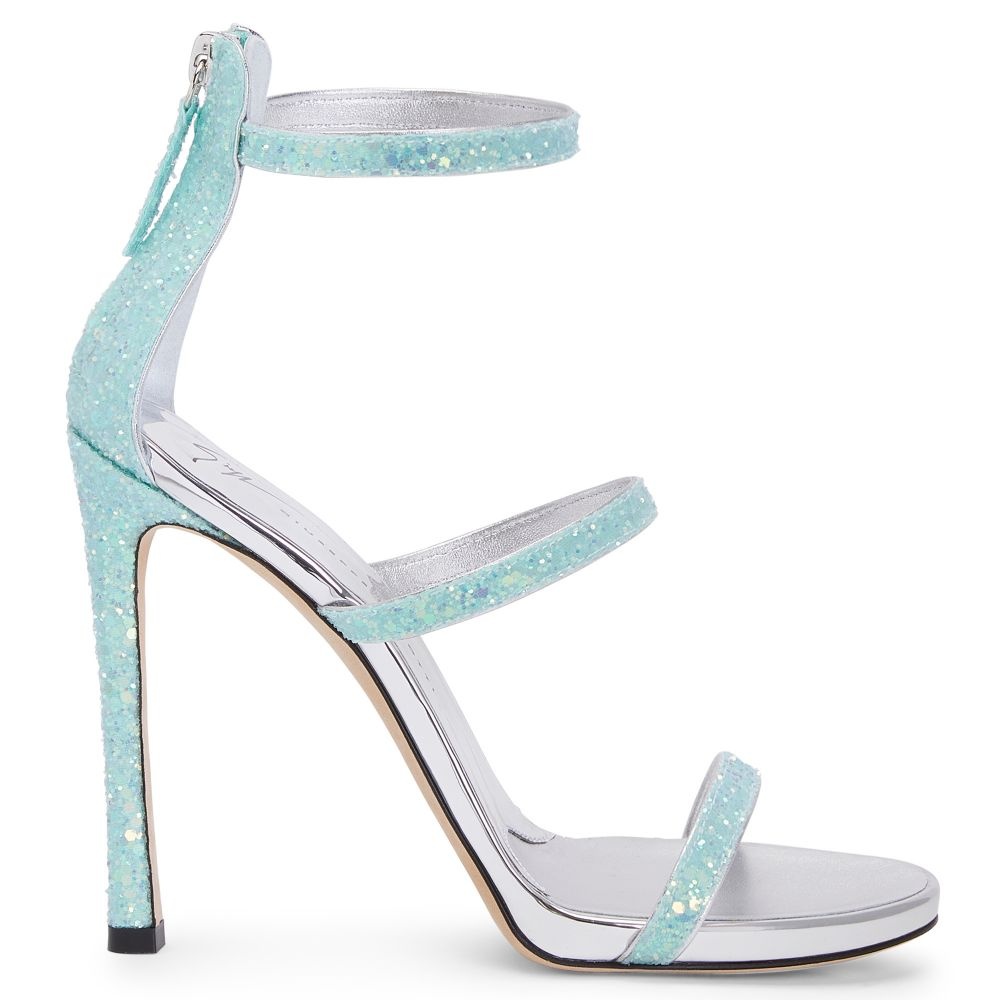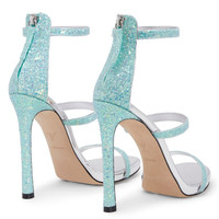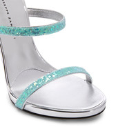 Product Details Sandals crafted from aquamarine synthetic fabric with glitter, featuring thin straps, a back zipper fastening with matching puller, matching covered stiletto heels with internal platform and a silver leather sole with logo. Aquamarine synthetic fabric with glitter (45% PVC GLITTER; 25% WATER BASED ADHESIVE; 30% COTTON) Three straps Zip fastening on the back Heel covered in aquamarine glitter synthetic fabric (45% PVC GLITTER; 25% WATER BASED ADHESIVE; 30% COTTON) 120 mm heel 10 mm internal platform Leather sole with logo Made in Italy