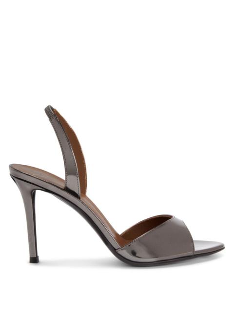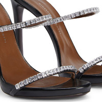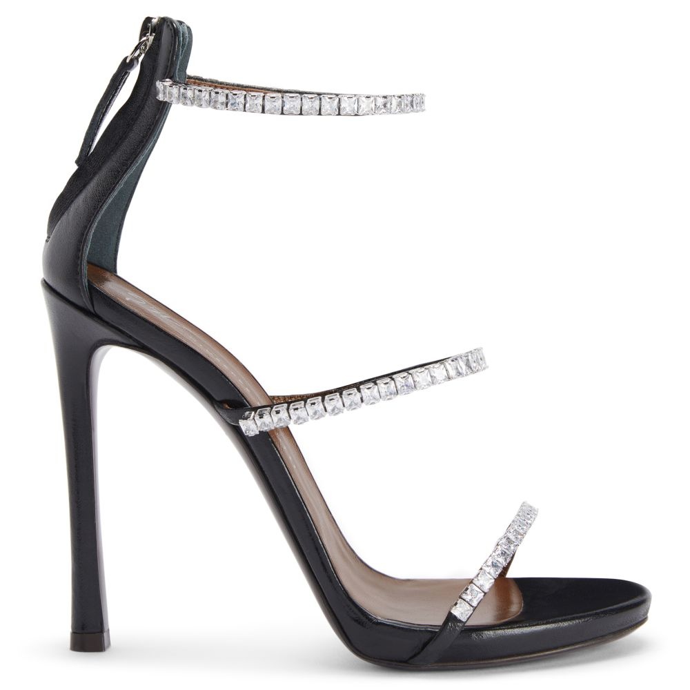 Product Details Leather sandals with rhinestone chain-adorned straps, rear zip fastening, stiletto heel and inner platform. - Black leather - Silver-coloured metal chain accessory and crystal-coloured rhinestones - 120 mm-high heel covered in black leather - 10 mm-high platform covered in black leather - Brown leather sole with logo ORIGIN: ITALY COLOR: BLACK