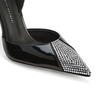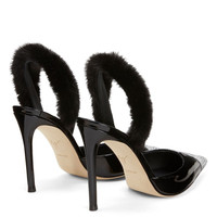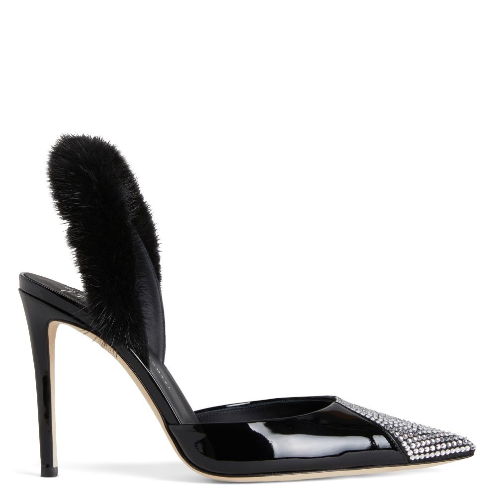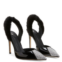 Product Details Pointed slingback pumps crafted from black patent leather and suede with matching covered stiletto heels and black leather sole, featuring a purple mink fur slingback strap and crystal rhinestone embroidery on the toe box that give the shoe an ultra-glamorous allure. Black patent leather and suede upper Black mink fur slingback strap Toe box with crystal rhinestones embroidery 105 mm heel Heel covered in black patent leather Leather sole with logo Made in Italy