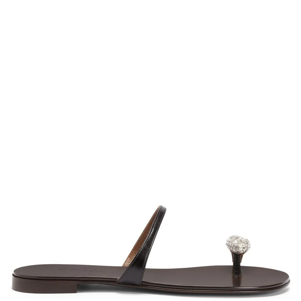 Product Details Giuseppe Zanotti celebrates its thirtieth birthday with an exclusive capsule collection embodying timeless elegance. A capsule born from the union between high-jewellery mastery and fine Italian craftsmanship. Flat thong sandals in leather with rhinestone ring accessory. - Black leather - Silver metal accessory and crystal-coloured rhinestones - 10mm-high heel - Glossy brown leather sole with logo ORIGIN: ITALY COLOR: BLACK