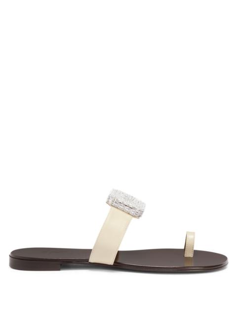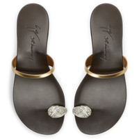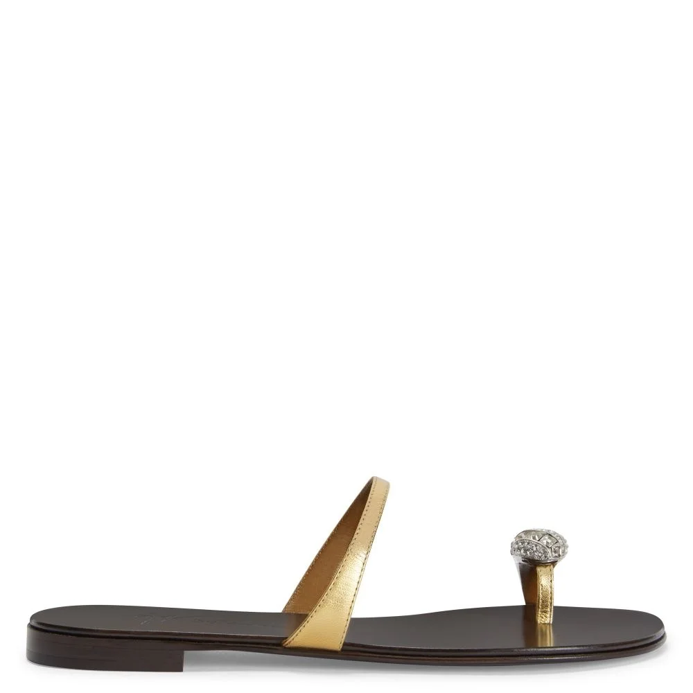 Product Details Giuseppe Zanotti celebrates its thirtieth birthday with an exclusive capsule collection embodying timeless elegance. A capsule born from the union between high-jewellery mastery and fine Italian craftsmanship. Flat thong sandals in leather with rhinestone ring accessory. - Laminated golden leather - Silver metal accessory and crystal-coloured rhinestones - 10mm-high heel - Glossy brown leather sole with logo ORIGIN: ITALY COLOR: GOLD