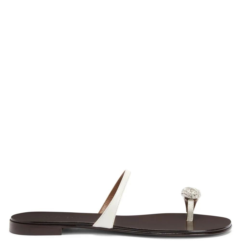 Product Details Giuseppe Zanotti celebrates its thirtieth birthday with an exclusive capsule collection embodying timeless elegance. A capsule born from the union between high-jewellery mastery and fine Italian craftsmanship. Flat thong sandals in leather with rhinestone ring accessory. - Ivory-white leather - Silver metal accessory and crystal-coloured rhinestones - 10mm-high heel - Glossy brown leather sole with logo ORIGIN: ITALY COLOR: WHITE