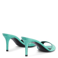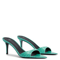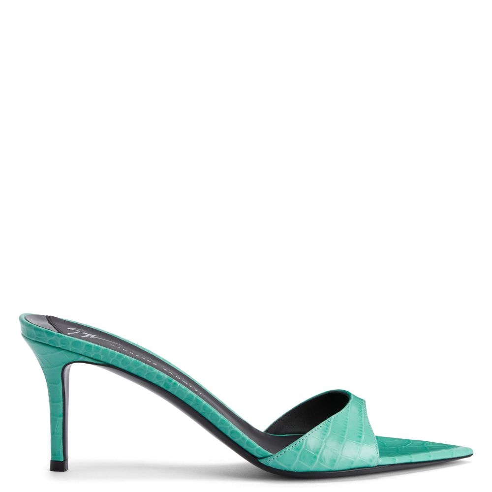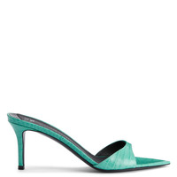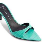 Product Details These open and pointed toe mules are crafted from aquamarine leather with a crocodile print and feature black leather soles and matching covered stiletto heels. Crocodile-print aquamarine leather 70 mm heel covered in crocodile-print aquamarine leather Black leather sole with logo Made in Italy