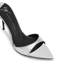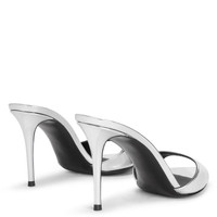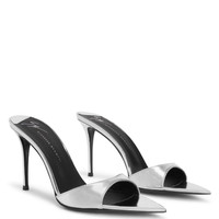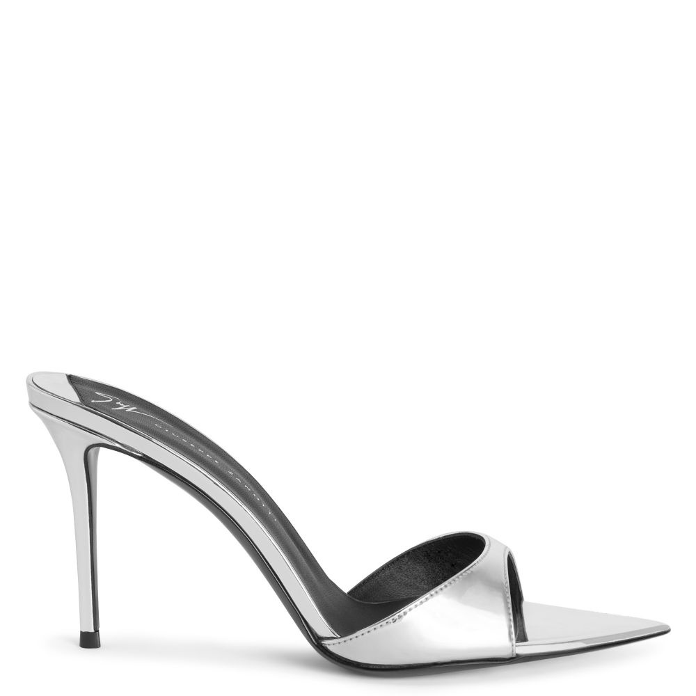 Product Details These open and pointed toe mules are crafted from mirror-effect silver synthetic fabric and feature leather soles and matching covered stiletto heels. - Mirror-effect silver synthetic fabric - 90 mm heel covered in silver mirror-effect synthetic fabric - Black leather sole with logo - Made in Italy ORIGIN: ITALY COLOR: SILVER