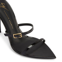 Product Details These pointed open-toe sandals, crafted from black synthetic fabric with a patent effect, feature black leather soles, matching covered stiletto heels, adjustable thin matching ankle straps with small side golden metal buckles. - Patent-effect black synthetic fabric - Patent-effect black synthetic fabric straps with golden metal buckles - 105 mm heel covered in patent-effect black synthetic fabric - Black leather sole with logo - Made in Italy ORIGIN: ITALY COLOR: BLACK