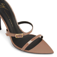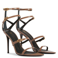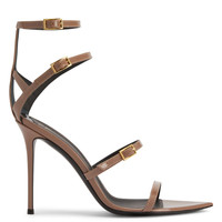 Product Details These pointed open-toe sandals, crafted from taupe synthetic fabric with a patent effect, feature black leather soles, matching covered stiletto heels, adjustable thin matching ankle straps with small side golden metal buckles. Patent-effect taupe synthetic fabric Patent-effect taupe synthetic fabric straps with golden metal buckles 105 mm heel covered in patent-effect taupe synthetic fabric Black leather sole with logo Made in Italy