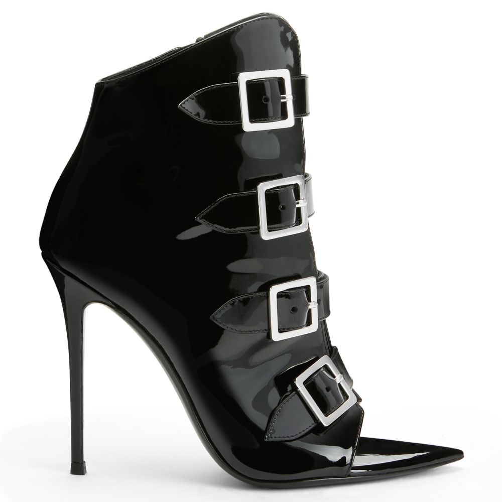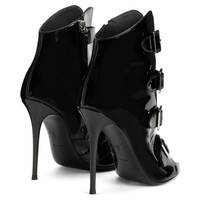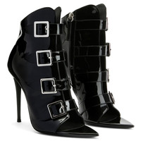 Product Details These open-toe ankle boots, crafted from black patent-effect synthetic fabric, feature matching straps with silver metal buckles on the upper, matching covered stiletto heels and a leather sole. Black patent-effect synthetic fabric (34% PL; 66% PU) Black patent-effect synthetic fabric straps (34% PL; 66% PU) with silver-coloured metal buckles 105 mm heel Heel covered in black patent-effect synthetic fabric (34% PL; 66% PU) Leather sole with logo Made in Italy