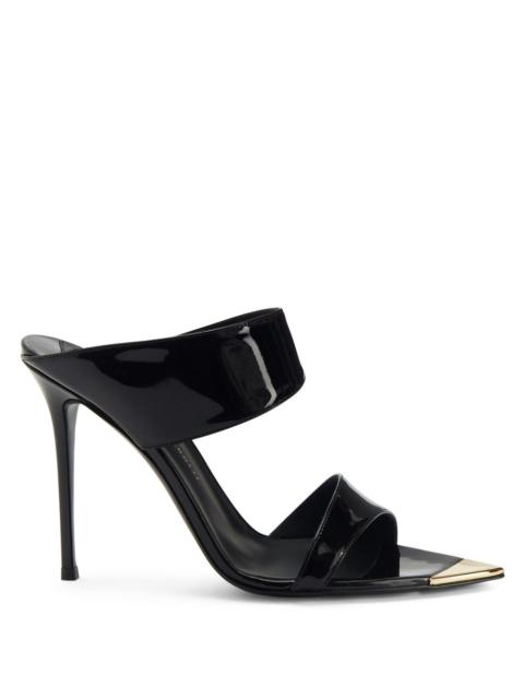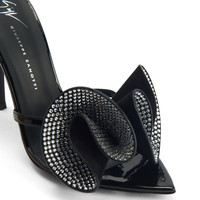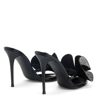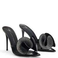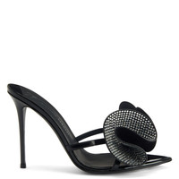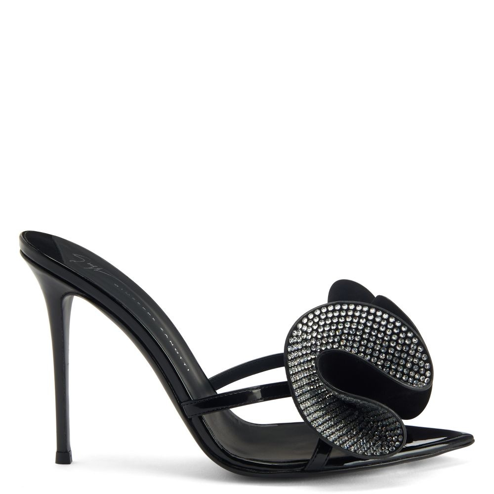 Product Details Pointed-toe mules crafted from patent-effect black synthetic fabric with a leather sole, embellished by a matching flower applique with crystal rhinestones on the straps and featuring matching stiletto heels. Patent-effect black synthetic fabric Black suede flower applique with crystal rhinestones 105 mm heel Heel covered in patent-effect black synthetic fabric Black leather sole with logo Made in Italy