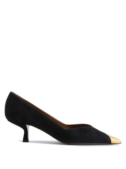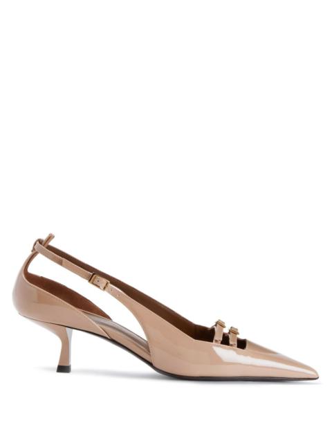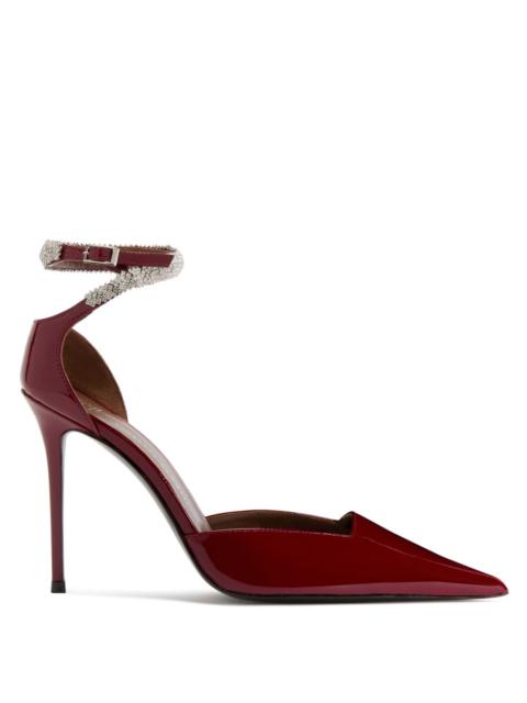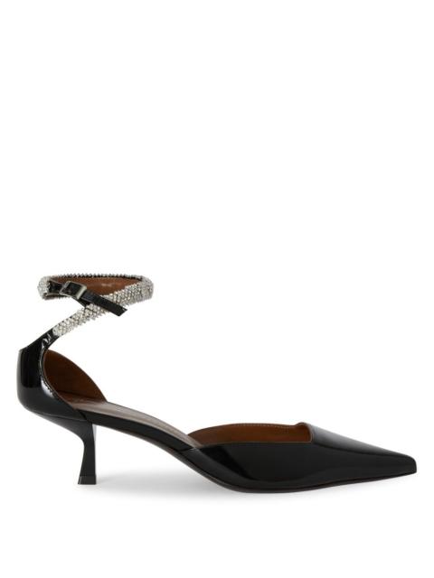 Product Details Pointed open-toe pumps in patent leather with metal toe detail, set square and baguette rhinestones, and stiletto heel. - Upper: 100% patent calfskin - Lining: goatskin - Insole: goatskin - Sole: leather - Heel height: 105mm ORIGIN: ITALY COLOR: BLACK