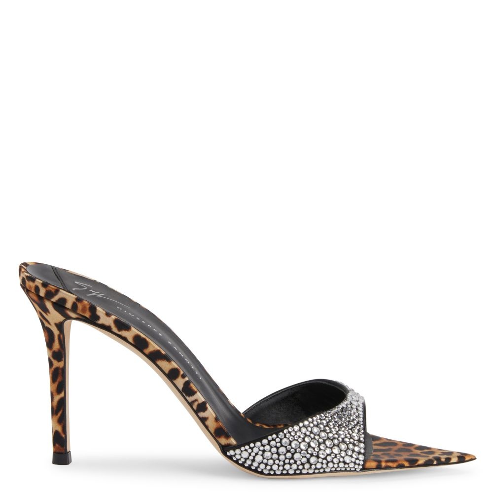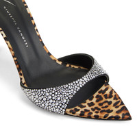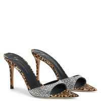 Product Details These pointed and open-toe mules, crafted in black synthetic satin with soles covered in natural-looking spotted silk, are embellished with a crystal rhinestones embroidery on the front band and feature leather soles and a matching covered stiletto heels. Black synthetic satin fabric with natural-looking spotted silk sole covering All-over crystal rhinestones embroidery 90 mm heel Heel covered in silk with natural-looking spotted print Leather sole with logo Made in Italy
