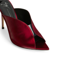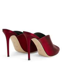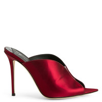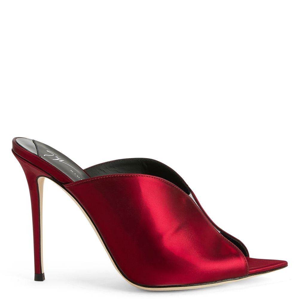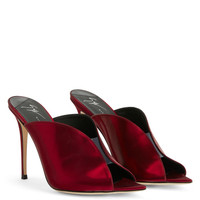 Product Details Pointed-toe mules crafted from laminated burgundy synthetic fabric with a leather sole, featuring an enveloping upper and matching covered stiletto heels. Laminated-effect burgundy synthetic fabric 105 mm heel Heel covered in laminated burgundy synthetic fabric Black leather sole with logo Made in Italy
