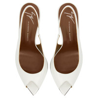 Product Details Open-toe slingback sandals in patent leather with geometric topline, pointed insole and stiletto heel. - Off-white patent leather - 90 mm-high heel - Brown leather sole with logo ORIGIN: ITALY COLOR: WHITE