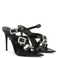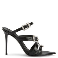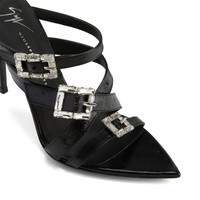 Product Details These mules, crafted from black leather with an ostrich print, feature crossed straps with silver metal buckles and rectangular crystal rhinestones, matching covered stiletto heels and black leather soles with logo. Black ostrich-print leather Silver metal buckles with rectangular crystal rhinestones 105 mm heel Heel covered in black ostrich-print leather Black leather sole with logo Made in Italy