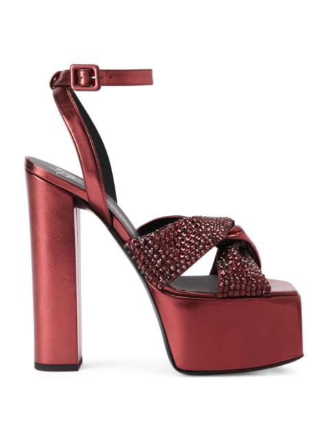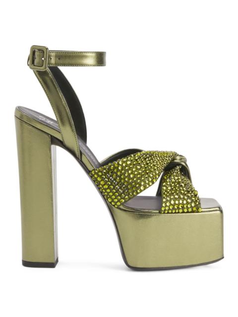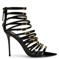 Product Details Pointed-toe sandals in patent-effect fabric with thin strips, adjustable metal buckles and stiletto heel. - Patent-effect black synthetic fabric - Patent-effect black synthetic fabric straps with golden metal buckles - 105 mm heel covered in patent-effect black synthetic fabric - Leather sole with logo ORIGIN: ITALY COLOR: BLACK