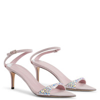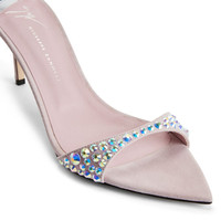 Product Details These open and pointed-toe sandals, crafted from lilac suede, feature matching covered stiletto heels and are embellished on the front band with a crystal Aurora Borealis embroidery; a leather sole and an adjustable ankle strap with a silver metal buckle give the design a perfect finish. Lilac suede Adjustable lilac patent leather strap with silver metal buckle Crystal AB rhinestones embroidery 70 mm heel covered in lilac suede Leather sole with logo Made in Italy
