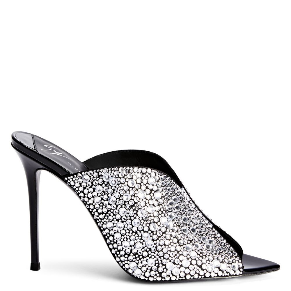 Product Details These pointed mules are crafted from black synthetic fabric with a satin effect and feature black leather stiletto heels with a patent effect, black leather soles and an upper embellished with an all-over crystal-coloured rhinestone embroidery. Black synthetic fabric with satin effect All-over crystal rhinestone embroidery 105 mm heel Heel covered in black patent-effect synthetic fabric (34% PL; 66% PU) Black leather sole with logo Made in Italy