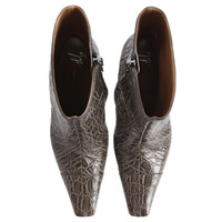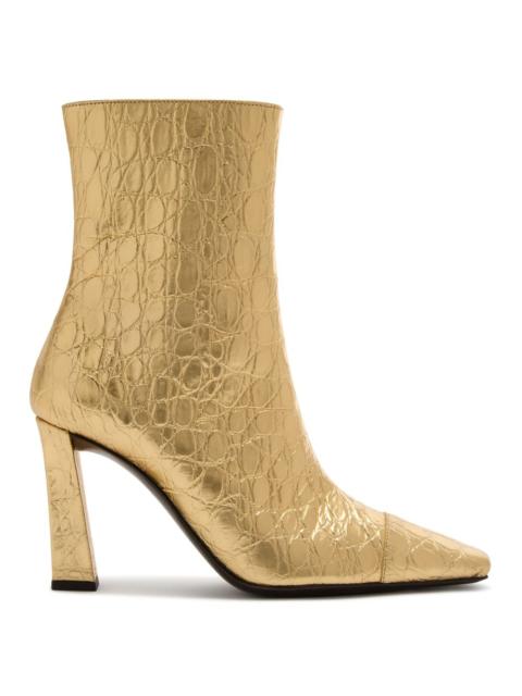 Product Details Ankle boots in crocodile-print leather with elongated square toe, inner zipper to help put them on and metal stitch detail on the heel. - Gray crocodile-print leather - Black inner side zipper and gold-colored metal detail on the heel - Heel height: 90 mm. - Brown leather sole and black non-slip rubber with logo ORIGIN: ITALY COLOR: GREY