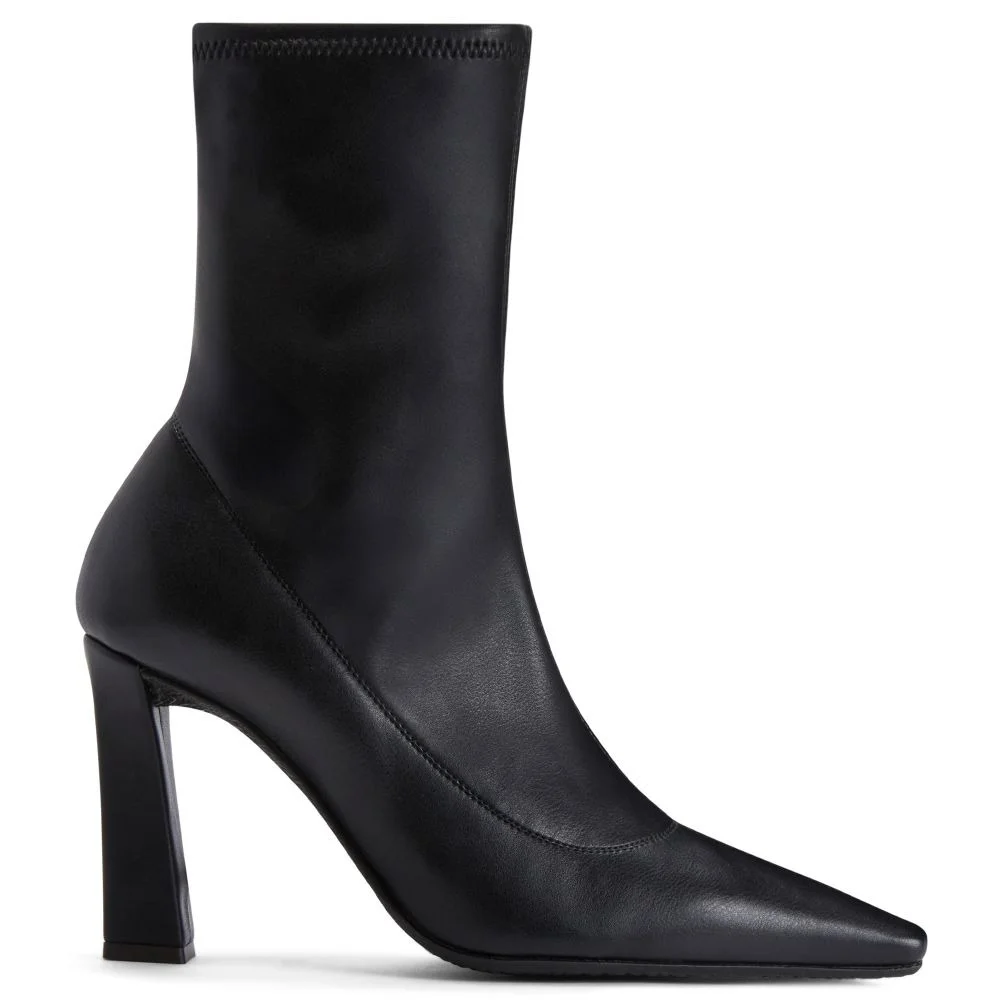 Product Details Ankle boots in leather-effect stretch fabric with elongated square toe and metal stitch detail on the heel. - Black leather-effect stretch fabric - Light gold-colored metal detail on the heel - Heel height: 90 mm. - Black rubber sole with logo ORIGIN: ITALY COLOR: BLACK