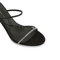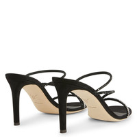 Product Details These mules are crafted from black suede and feature thin straps embellished with a black and crystal-coloured rhinestone embroidery and a matching stiletto heel. Black suede Black and crystal-coloured rhinestone embroidery Heel covered in black suede 85 mm heel Leather sole with logo Made in Italy