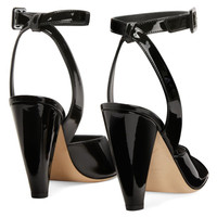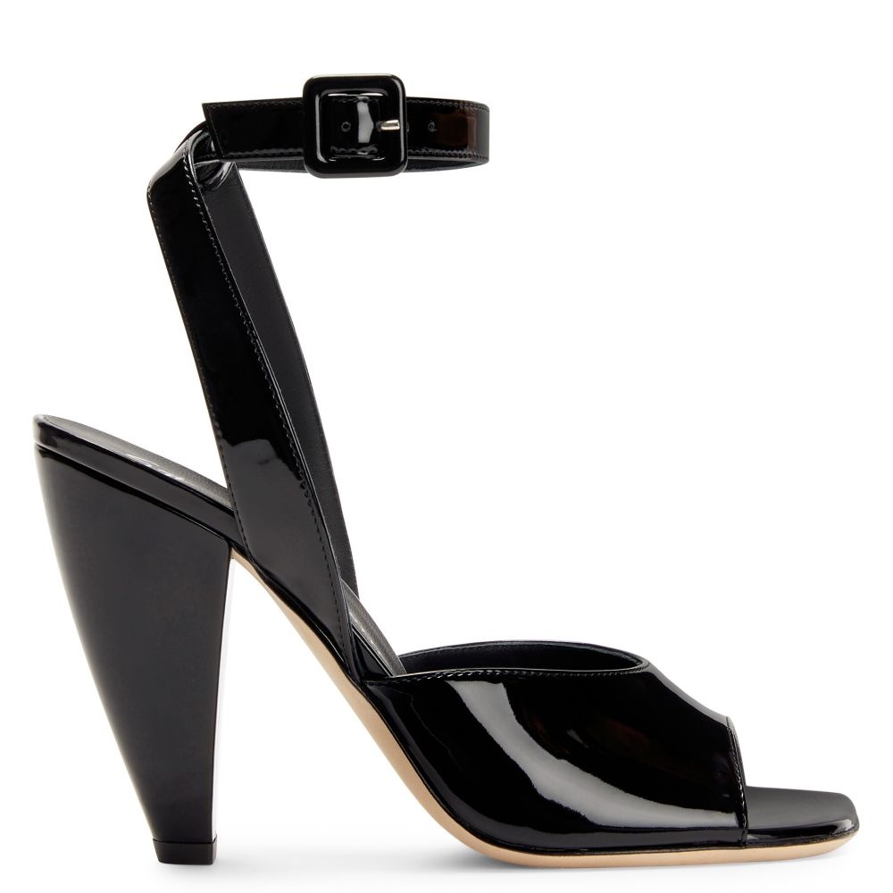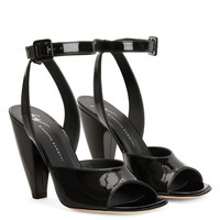 Product Details These open-toe sandals in black patent-effect synthetic fabric feature an adjustable ankle strap with a small upper-matching buckle and a matching covered conical heel. Black patent-effect fabric (34% PL; 66% PU) Adjustable ankle strap with buckle 105 mm heel Heel covered in black patent-effect synthetic fabric (34% PL; 66% PU) Leather sole with logo Made in Italy