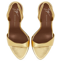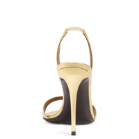 Product Details Slingback sandals in laminated leather with rear elastic strap, round toe and stiletto heel. - Laminated golden leather - 105 mm-high heel. - Brown leather sole with logo ORIGIN: ITALY COLOR: GOLD