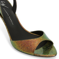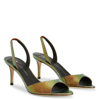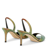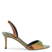 Product Details These slingback sandals are crafted from patent-effect iridescent multicoloured glittery synthetic fabric with matching covered stiletto heels. A leather sole and an elastic slingback strap give the design a perfect finish. Patent-effect multicoloured and iridescent synthetic fabric Heel covered in patent-effect, multicoloured and iridescent synthetic glitter fabric 70 mm heel Leather sole with logo Made in Italy