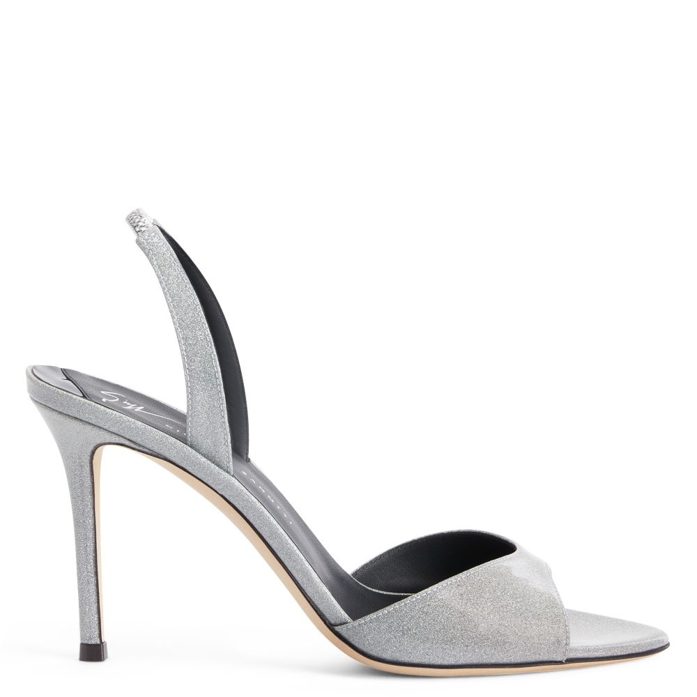 Product Details These slingback sandals are crafted from patent-effect silver glitter synthetic fabric and feature matching covered stiletto heels. A leather sole with logo and an elastic slingback strap give the design a perfect finish. Patent-effect glitter silver synthetic fabric Heel covered in patent-effect silver synthetic glitter fabric 90 mm heel Leather sole with logo Origin Italy Color Silver More Minus