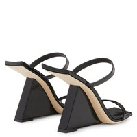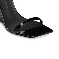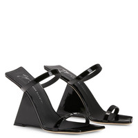 Product Details Mule sandals in black patent-effect synthetic fabric. Complete with leather sole and minimalist strips, this shoe is characterised by its squared edges and peculiar silhouette that gives it an alluring futuristic style. Black patent-effect synthetic fabric: 34%PL 66%PU Wedge height 105 mm Leather sole with logo Made in Italy