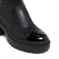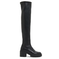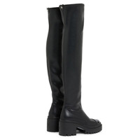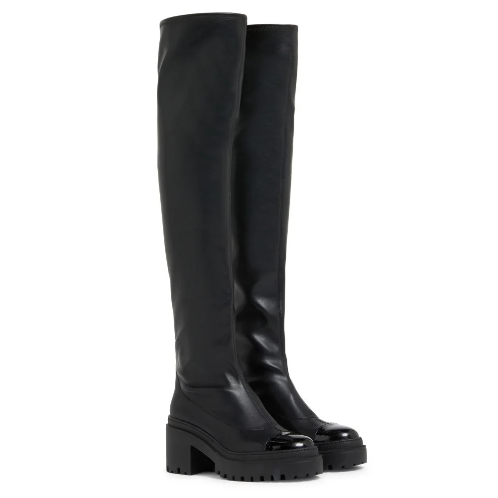Product Details Over-the-knee boots in leather-effect stretch fabric with patent leather toe, metal stud on the rear pull and one-piece rubber sole. - Black leather-effect synthetic stretch fabric upper and black patent leather toe cap - Gunmetal grey metal stud detail - Heel height: 70 mm - One-piece black rubber sole with logo ORIGIN: ITALY COLOR: BLACK