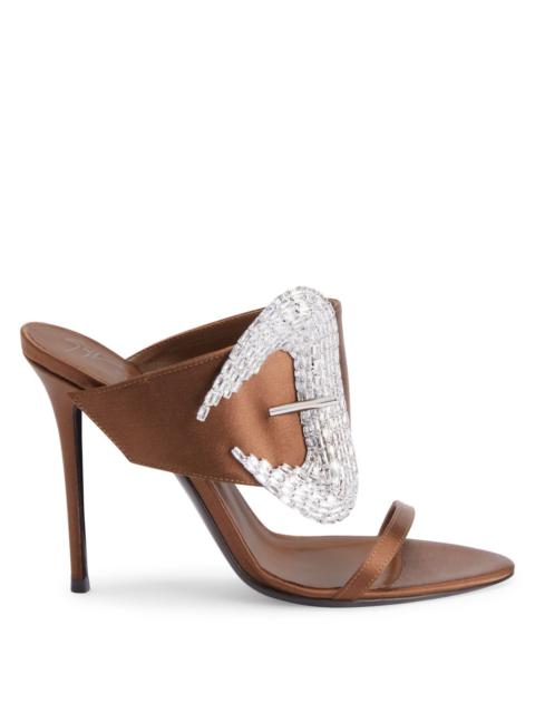 Product Details Satin mules with a large embellished crystal buckle and stiletto heel. - Blue synthetic satin fabric - Large silver metal buckle detail with crystal-colored rhinestones - 105 mm heel - Heel covered in blue synthetic satin fabric - Brown leather sole with logo ORIGIN: ITALY COLOR: BLUE