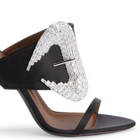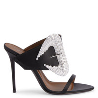 Product Details Satin mules with a large embellished crystal buckle and stiletto heel. - Black synthetic satin fabric - Large silver metal buckle detail with crystal-colored rhinestones - 105 mm heel - Heel covered in black synthetic satin fabric - Brown leather sole with logo ORIGIN: ITALY COLOR: BLACK