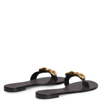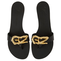 Product Details This flat thong sandal made of black leather is embellished with a golden metal 'Logozalì' accessory applied to the band and features a leather sole with logo. Black leather Golden metal 'Logozalì' accessory 10 mm heel Leather sole with logo Made in Italy