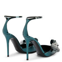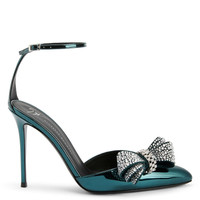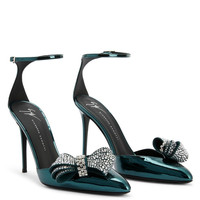 Product Details These pointed toe pumps, crafted from mirrored-effect green synthetic fabric, feature matching covered stiletto heels, a black leather sole and adjustable ankle straps with a silver metal buckle and are embellished by a green suede bow applique with crystal rhinestones on the toe box. Mirrored-effect green synthetic fabric Green suede bow applique with crystal rhinestones and silver metal buckle 105 mm heel Heel covered in mirrored-effect green synthetic fabric Black leather sole with logo Made in Italy