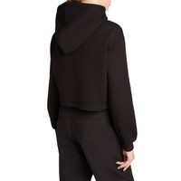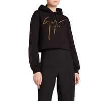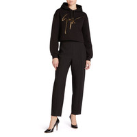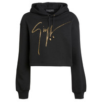 Product Details Hoodie crafted from black cotton blend fabric with adjustable drawstring closure and elastic cuffs, featuring an golden rhinestone 'Signature' embroidery on the front. Fabric (70% CO; 30% PO) Golden rhinestone 'Signature' embroidery Made in Italy