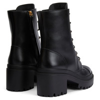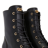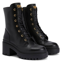 Product Details Lace-up biker ankle boots in leather with rubber one-piece sole. - Black leather - Golden metal 'Logozali' detail - 70 mm heel - 50 mm platform - Black rubber sole with logo ORIGIN: ITALY COLOR: BLACK