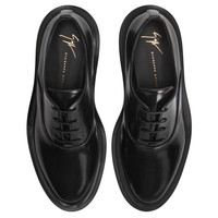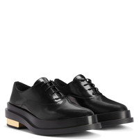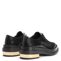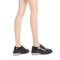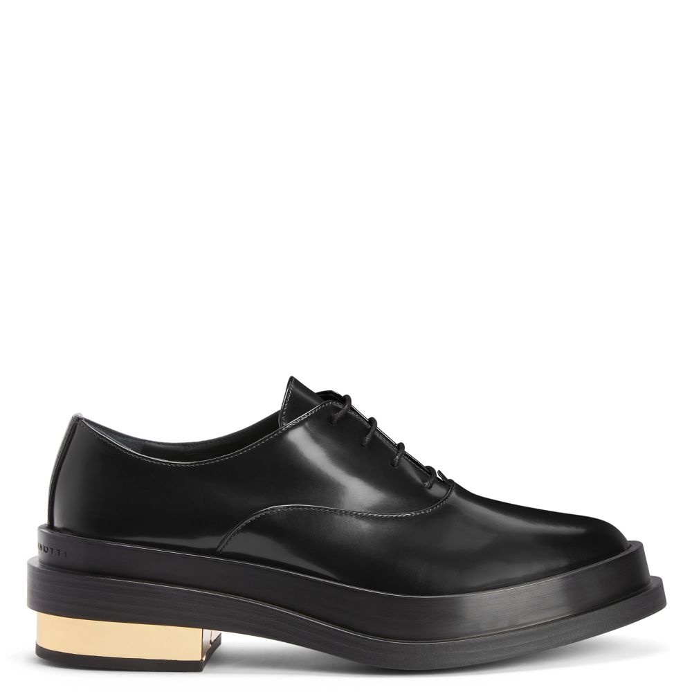 Product Details These Oxford shoes are crafted from polished black synthetic fabric with matching laces and feature a one-piece oversized rubber sole embellished with a mirror-effect golden synthetic fabric detail on the heel. Black polished effect synthetic fabric Black laces Mirrored-effect golden synthetic fabric detail on heel 50 mm heel One-piece black rubber sole with logo Made in Italy