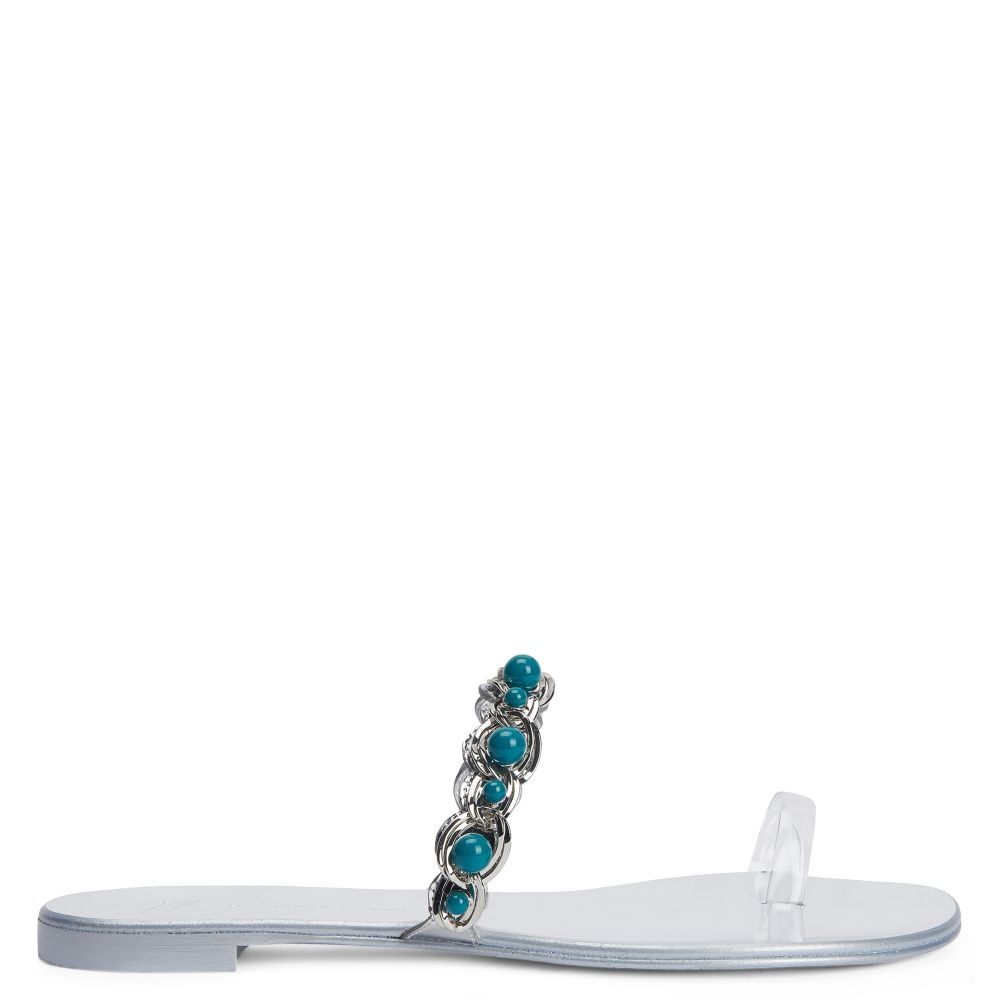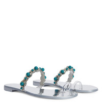 Product Details Flat thong sandals crafted from silver mirror-effect leather with a leather sole, featuring a clear PVC ring strap and a rear band embellished with a silver metal accessory with jade green lacquered stones. Clear PVC and silver mirror-effect leather Silver metal accessory and jade green lacquered stones 10 mm heel Silver laminated leather sole with logo Made in Italy