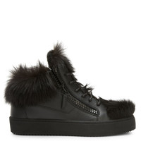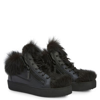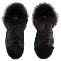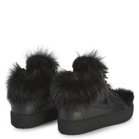 Product Details Mid-top sneakers crafted from black leather and real fur with matching cotton laces and shearling inner lining, featuring a black rubberised 'Signature' detail on the tongue and plastic side zippers on the upper; a black rubber sole gives the design a perfect finish. Black leather and real fur Black rubberised metal 'Signature' detail Black shearling inner lining Black cotton laces Black rubber sole with logo Made in Italy