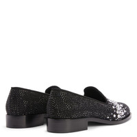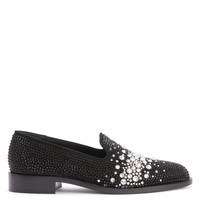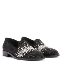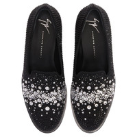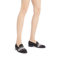 Product Details Loafers crafted from suede-effect black synthetic fabric with matching trims, leather sole and inner linings, and embellished with an all-over black and crystal rhinestones embroidery on the upper. Black suede-effect synthetic fabric and synthetic fabric trims All over black and crystal rhinestones embroidery 20 mm heel Black leather sole with logo Made in Italy