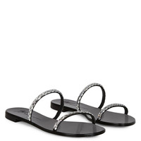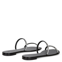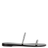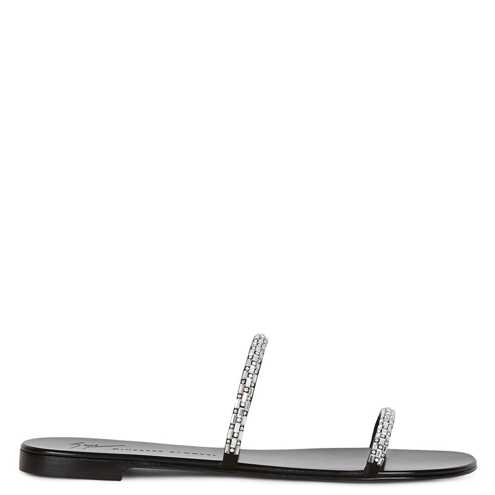 Product Details Flat sandals in black suede, with elegant thin strips embellished with crystal-coloured rhinestones, and leather sole. 10 mm heel Black suede Crystal-coloured rhinestone embroidery Leather sole with logo Made in Italy