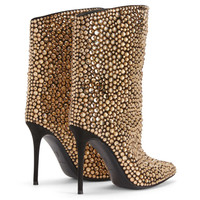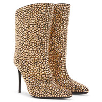 Product Details These pointed-toe ankle boots, crafted from suede-effect black synthetic fabric, are embellished by an all-over emerald beige rhinestones embroidery and feature matching covered stiletto heels, a black and silver metal zipper on the inner side and a black leather sole. Suede-effect black synthetic fabric Beige rhinestones all-over embroidery 105 mm heel Heel covered in suede-effect black synthetic fabric Black leather sole with logo Made in Italy