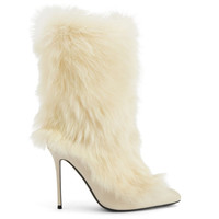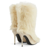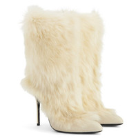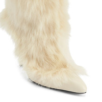 Product Details These pointed-toe boots are crafted from ecru leather and feature matching shearling covered leg shafts, a black leather sole and matching covered stiletto heels. Ecru leather and ecru shearling upper 105 mm heel Heel covered in ecru leather Black leather sole with logo Made in Italy