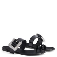 Product Details These flat thong sandals, crafted from black patent leather with matching leather soles, are embellished with a silver metal maxi buckle with crystal rhinestones on the back strap. Black patent leather Silver metal buckle with crystal rhinestones 10 mm heel Black leather sole with logo Made in Italy