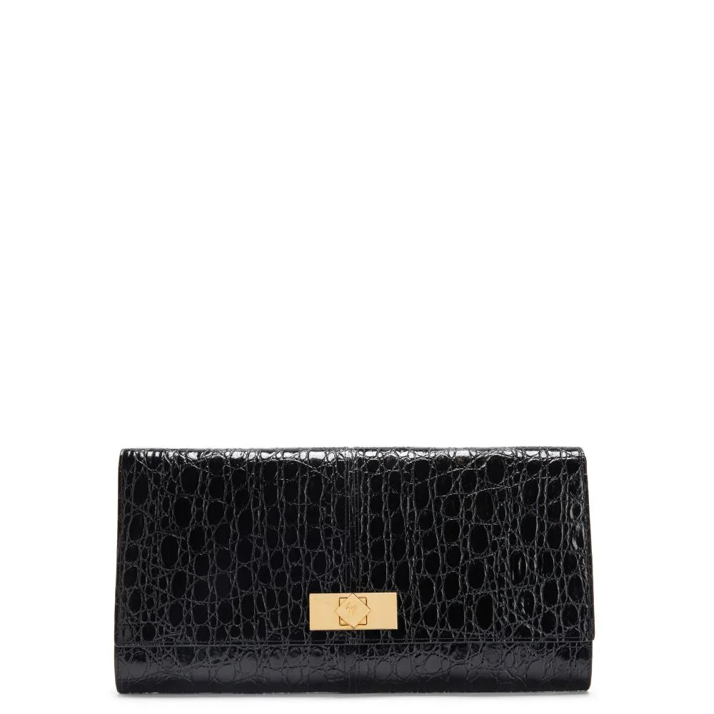 Product Details Crocodile-print leather clutch bag with stitching in the middle, custom central fastening, chain shoulder strap and inner card slots. - Black crocodile-print leather - Rigid golden metal nut-shaped turn lock closure - Golden metal shoulder strap - Black fabric inner lining with card slots - Size: 330 mm x 180 mm x 35 mm ORIGIN: ITALY COLOR: BLACK