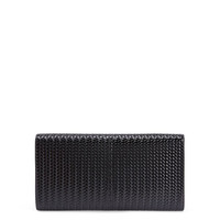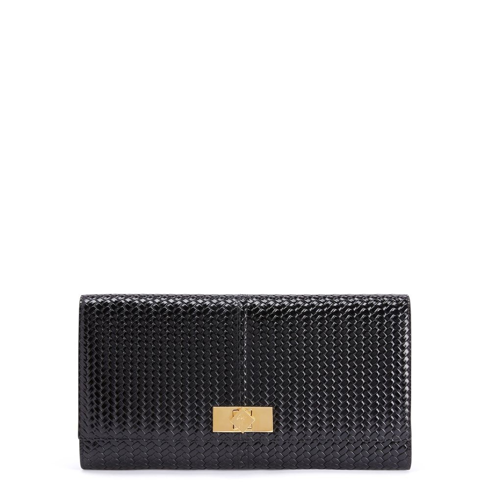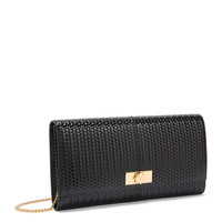 Product Details Clutch bag in woven-print leather with central seam, custom fastening in the middle, chain shoulder strap and inner card slots. - Black woven-print leather - Fastened with golden metal turn-lock clasp - Golden metal shoulder strap - Black fabric interior with card slots - Size: 330 mm x 180 mm x 35 mm ORIGIN: ITALY COLOR: BLACK