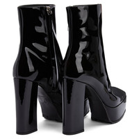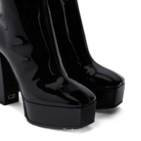 Product Details These black, patent-effect, stretch synthetic fabric ankle boots feature a black and silver metal zipper fastening on the inner side, matching covered chunky heels and platform and a small silver metal ‘GZ’ detail applied to the inner heel. Black patent-effect fabric (34% PL; 66% PU) Black and silver metal zipper on the inner side 120 mm heel 40 mm platform Rubber sole with logo Made in Italy