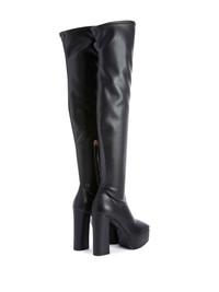 Product Details These black, leather-effect, stretch synthetic fabric knee-high boots feature a rubber sole and a soft tight shaft; the design is embellished with the golden metal 'GZ' detail on the inner heel and is complete with a black and golden metal inner side zipper and matching covered heels and platforms. Leather-effect black stretch synthetic fabric Golden metal ‘GZ’ detail on heel and black inner zip 120 mm heel covered in black leather-effect stretch synthetic fabric 40 mm platform covered in black leather-effect stretch synthetic fabric Black rubber sole with logo Made in Italy