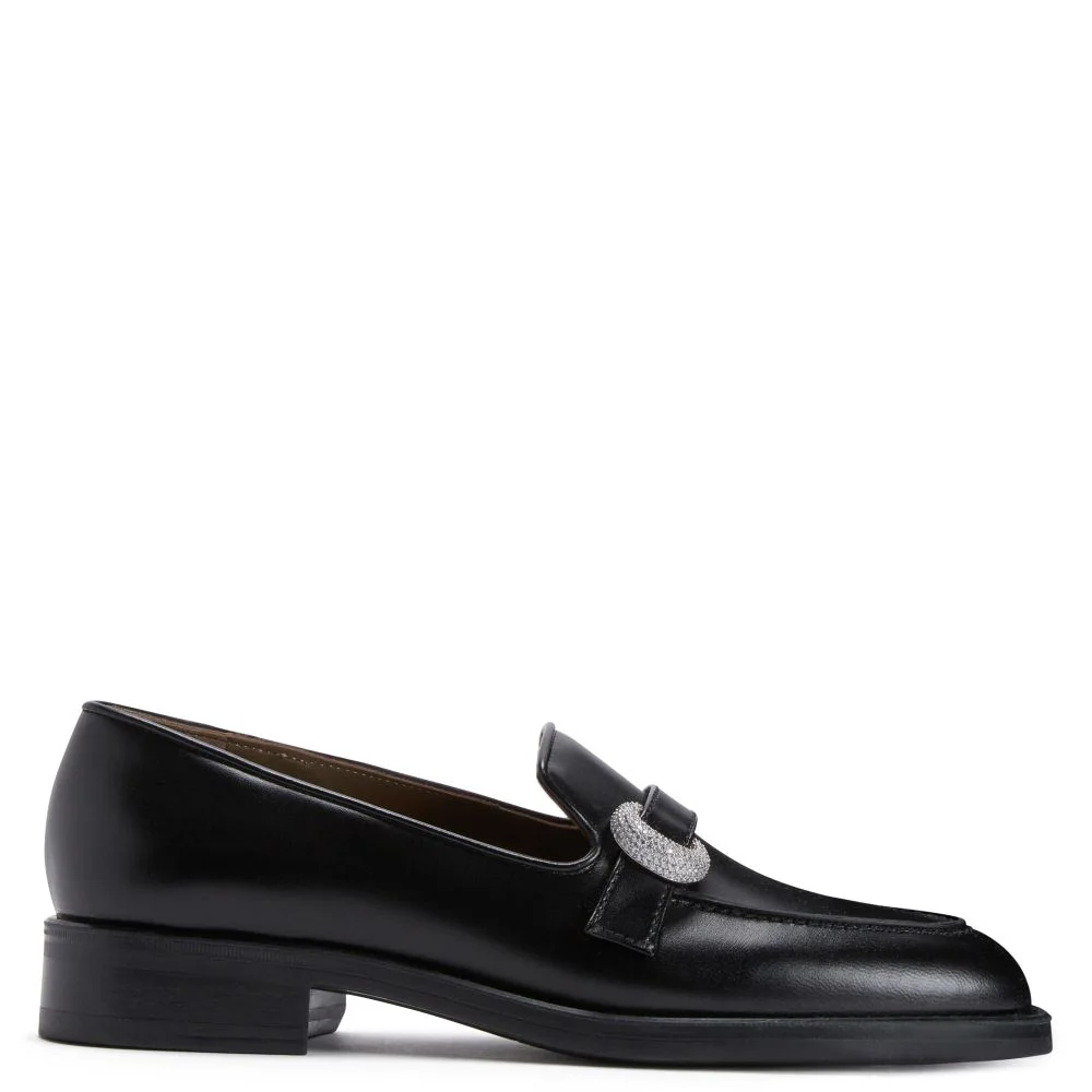 Product Details Leather loafers with irregular ring accessory adorned with pave-set crystal-colored rhinestones and rubber sole. - Upper: 100% calfskin - Lining: goatskin - Insole: goatskin - Sole: Rubber ORIGIN: ITALY COLOR: BLACK